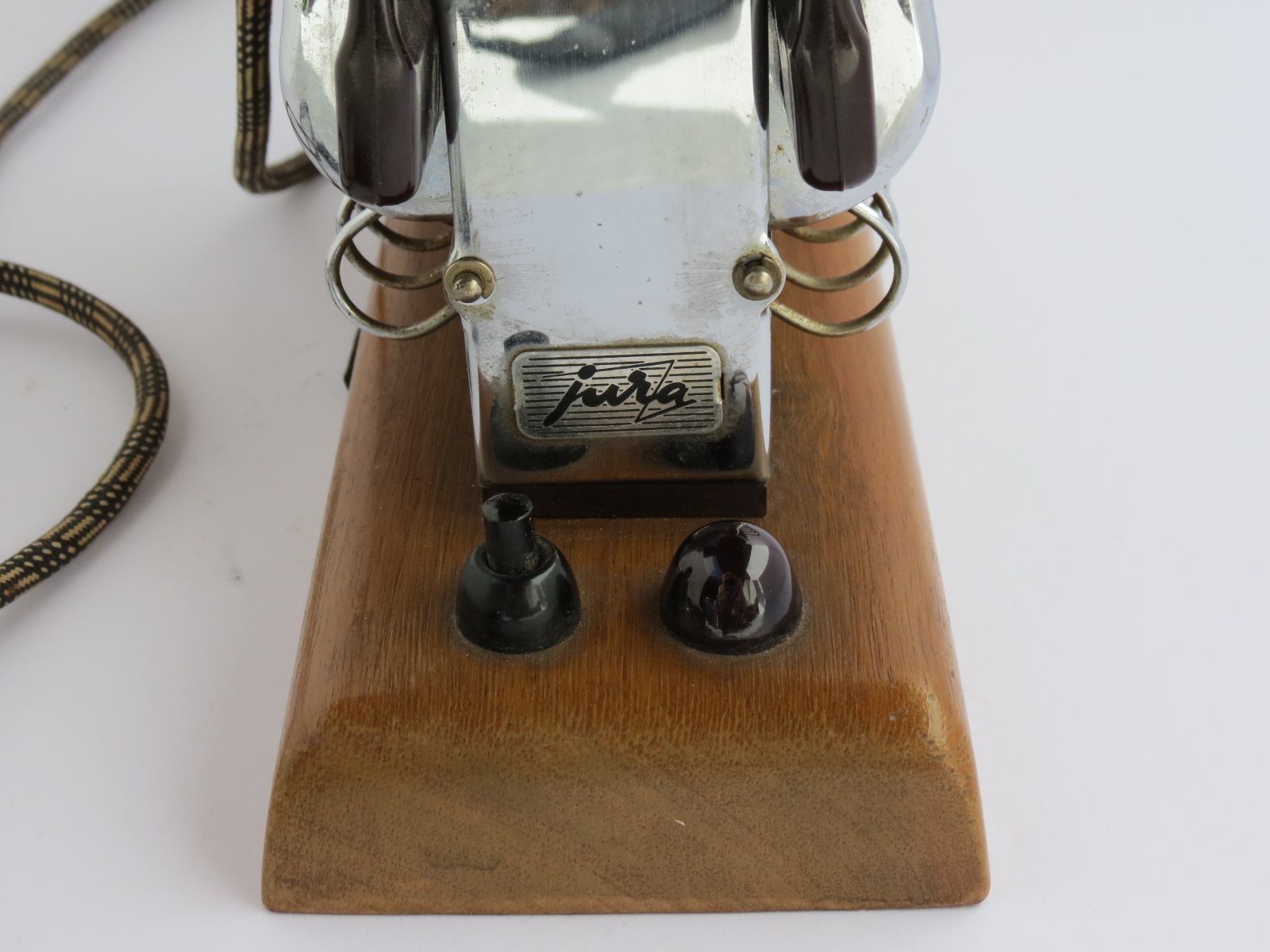 This beautifully designed toaster was made by a Swiss company named Jura, founded in 1931. The company is still operating in Switzerland, you can even buy a retro version of this classical designed toaster.
