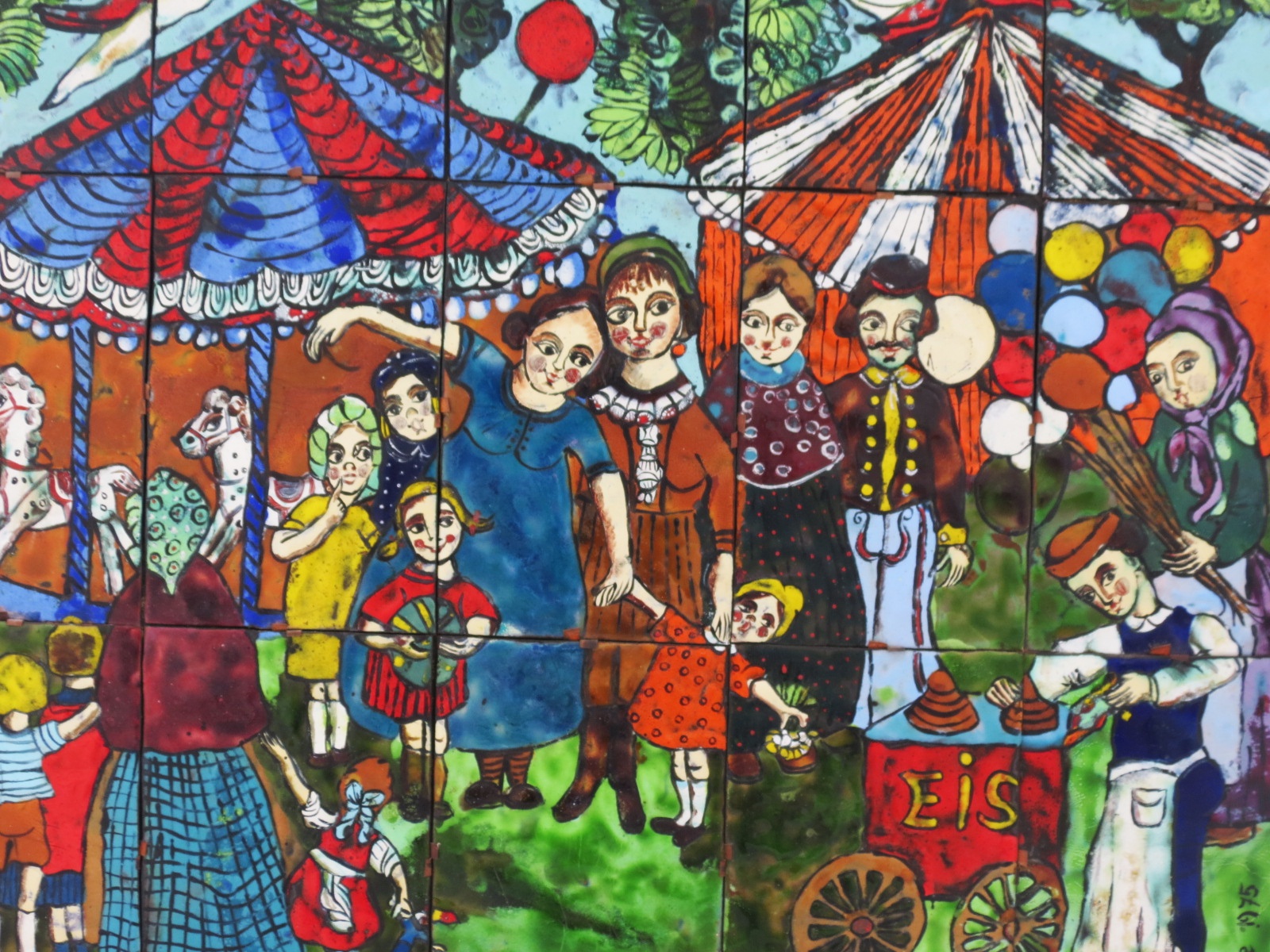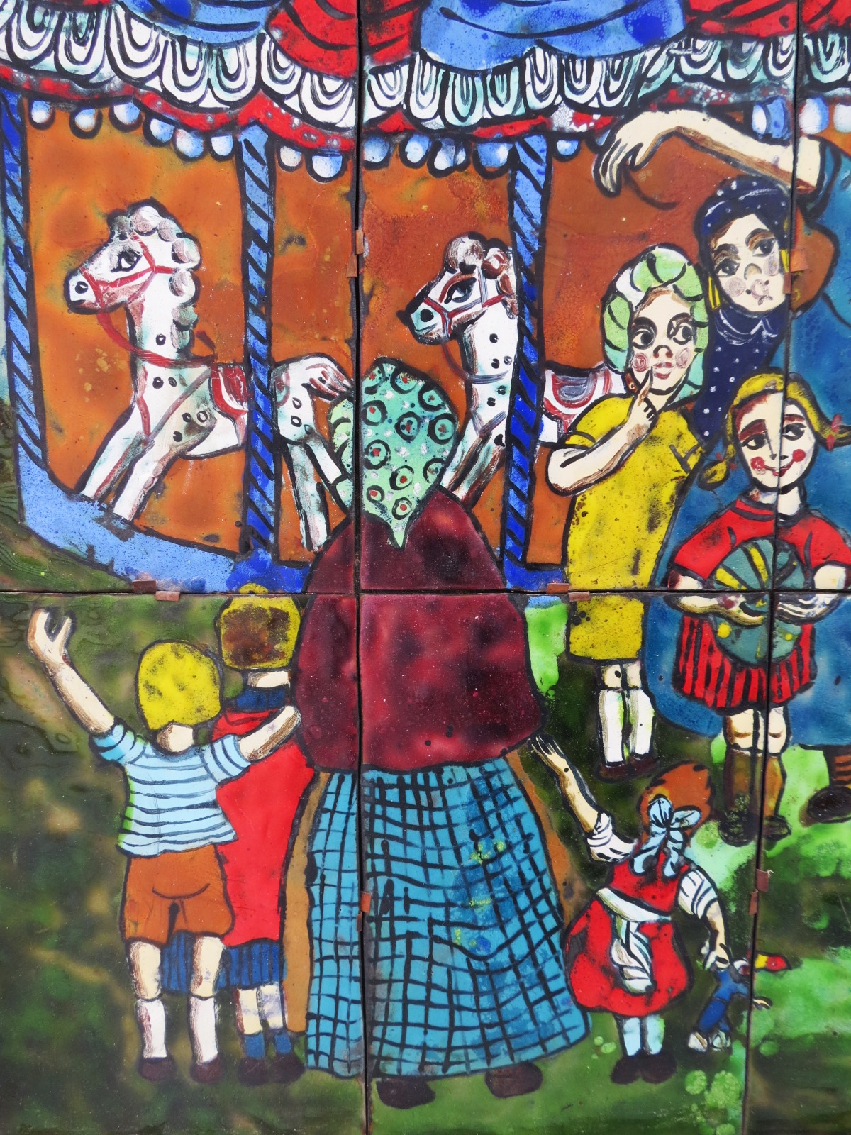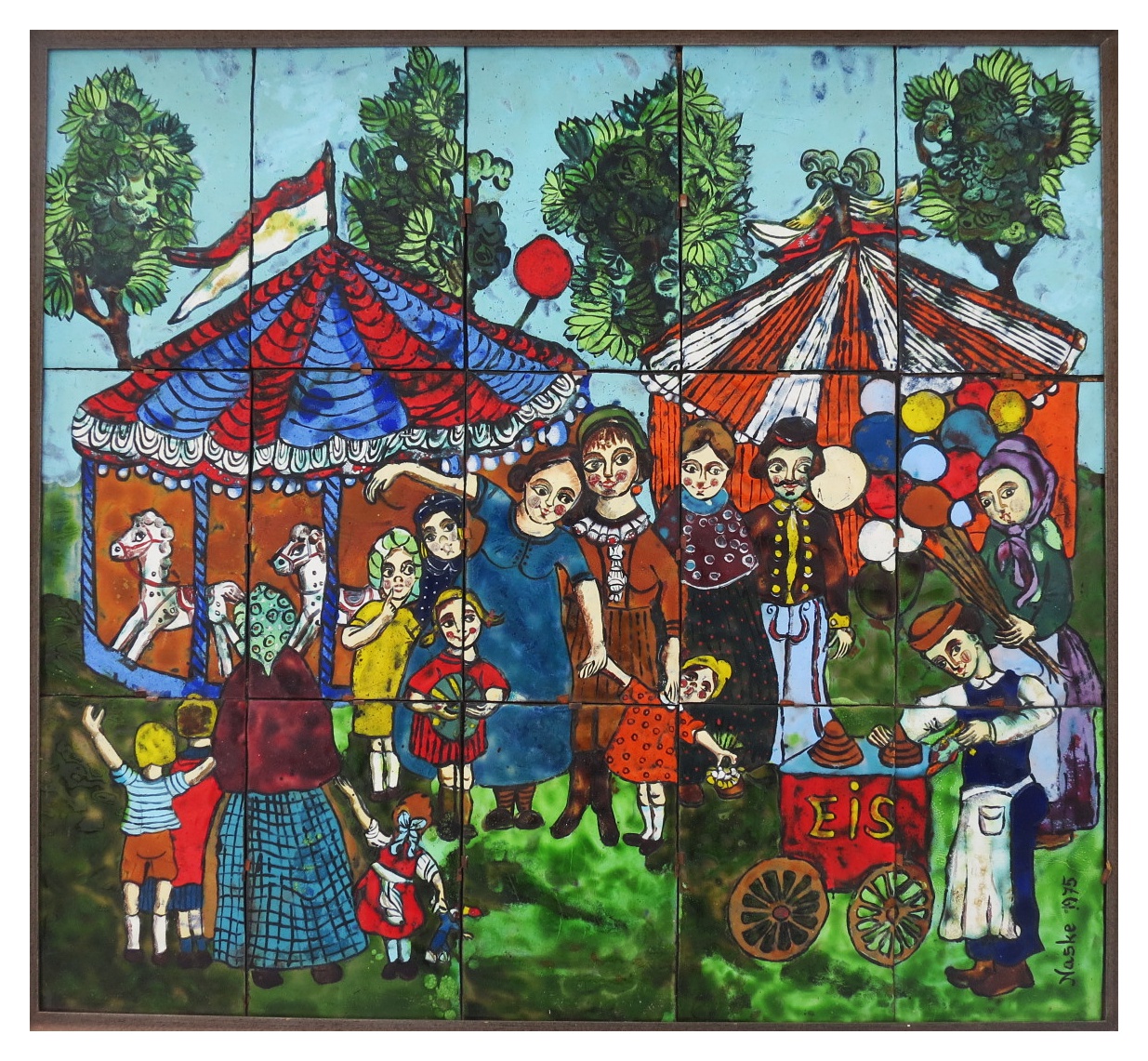 This beautiful piece is from 1975, signed by the Austrian artist Inge Naske. Its 15 tiles (20 x 13 cm) of copper joined with metal clasps. The entire work measures 59 x 65 cm.